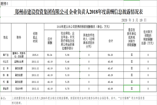 鄭州市建設(shè)投資集團有限公司企業(yè)負責人2018年度薪酬信息披露情況表